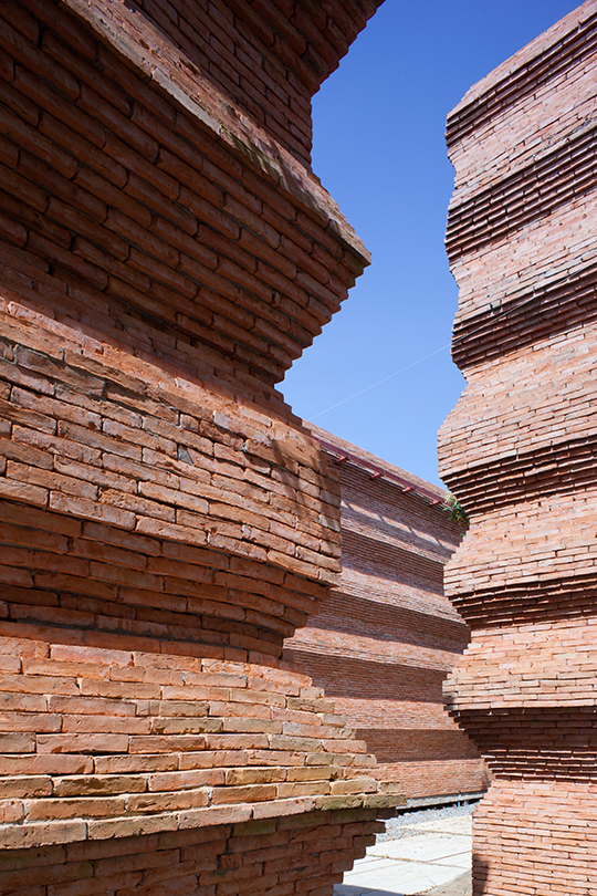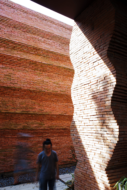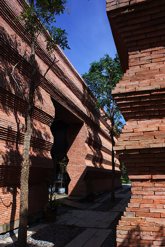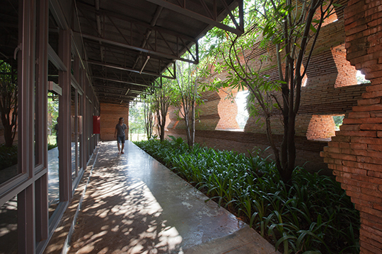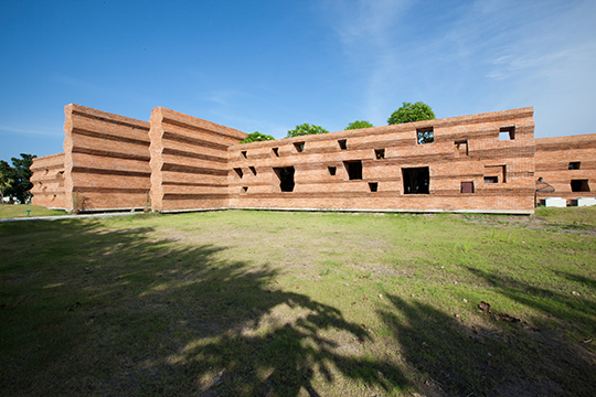 Student at Thailand's Kantana Film and Animation Institute will have an experiential understanding of the massive effort and care of a creative act. The home of undergraduate college, itself a manifestation of the country's largest film studio endeavoring to invest in local talent, was designed by Thai architect Boonserm Premthada and features eight-meter-high handmade brick walls. The architect states that the total sensory experience is universal, and therefore the built form, particularly when the program call for creative reflection should engender such a phenomena; as such over six hundred thousand handmade bricks were made locally and imbue the space with a distinctly human scale and touch.