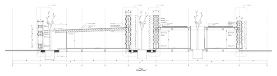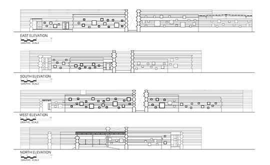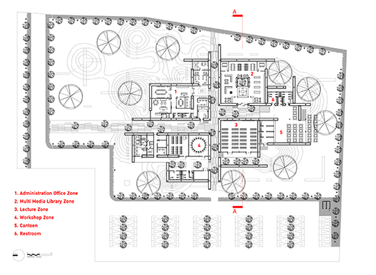 The staggeringly thick masonry is punctuated by orthogonal apertures at irregular intervals that serve both to help ventilate the spaces and provide quiet enclaves for sitting and relaxing. While the building is supported by an inner steel structure, the gap between the inner and outer skin of the edifice guards against heat transfer and naturally cools the spaces. The school is organized into 5 different area - administration, lecture rooms, a workshop, library and a canteen - all connect by a network of axial hallways, delineated by the undulating vertical planes of brick. While the rural site was challenging, the interior forest of gray stone and concrete paths extend the learning spaces and blurs the borders between built and natural space. The compositions of mass and void is intended to inform the student's thinking and help stimulate the kind of visual story-making required in the creation of a film. This is an architecture literally form by the human body and made all the more rich by the deeply human stories that will grow within its walls.